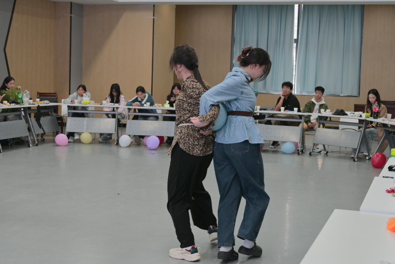 在备受期待的互动游戏环节,“击鼓传花”“趣味找朋友”“欢乐夹气球” 三项精心设计的活动依次开展。同学们踊跃参与、默契配合,在欢声笑语中增进了彼此了解,在并肩协作中加深了信任与友谊,现场氛围热烈而温馨,有效凝聚了团队向心力。