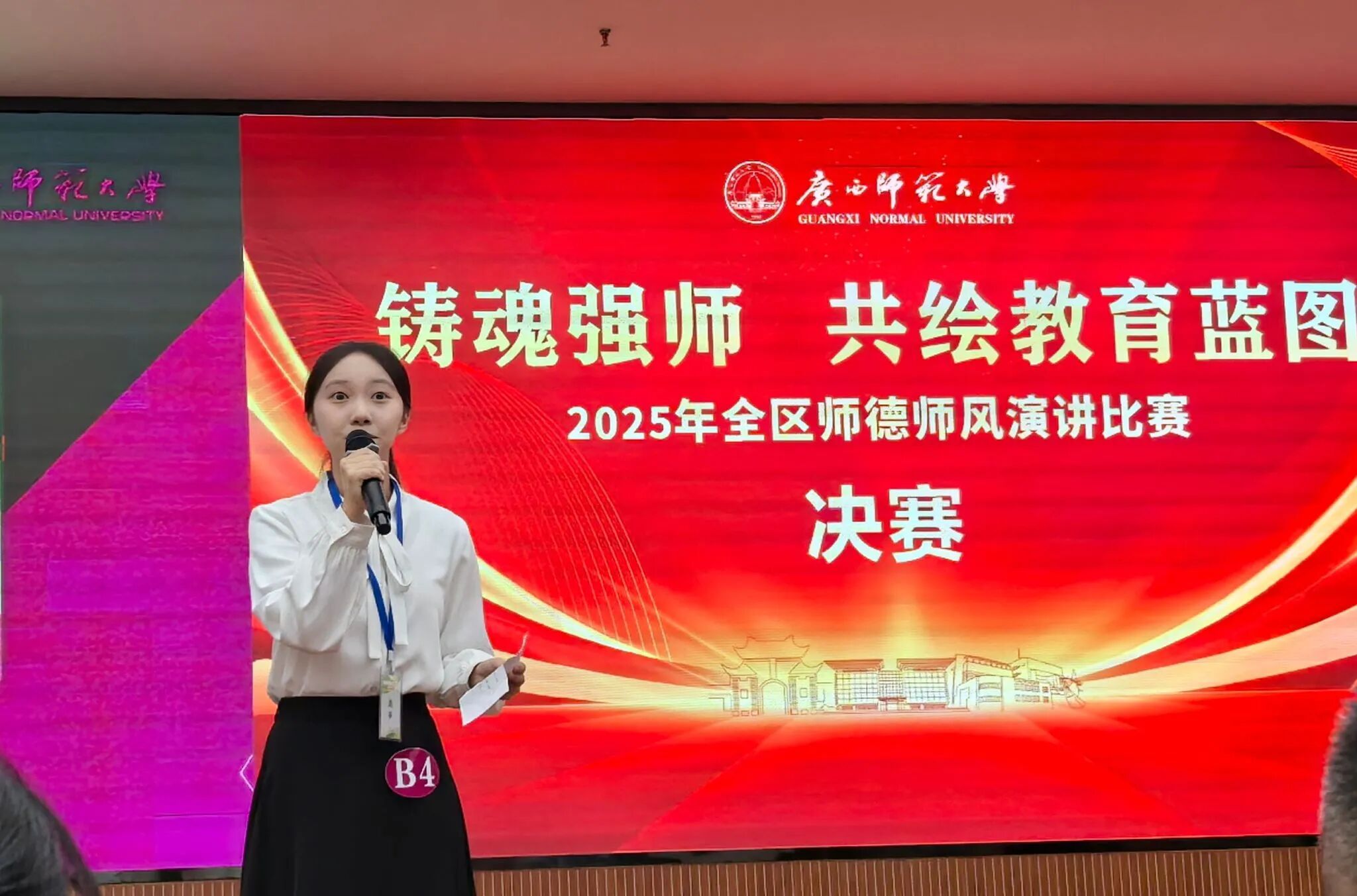 本次比赛共有来自全区的66名师范生参加。大赛为期2天,有主题演讲、即兴演讲两个环节。主题演讲以“铸魂强师,共绘教育蓝图”为主题,选手经过主题演讲环节的角逐后,比赛成绩排名前30%的选手进入决赛即兴演讲环节,争夺一等奖和二等奖。我校2名选手在初赛主题演讲环节发挥稳定,成功入围决赛,并在决赛中,凭借扎实的专业技能、丰富的知识储备以及出色的临场表现,最终收获佳绩。