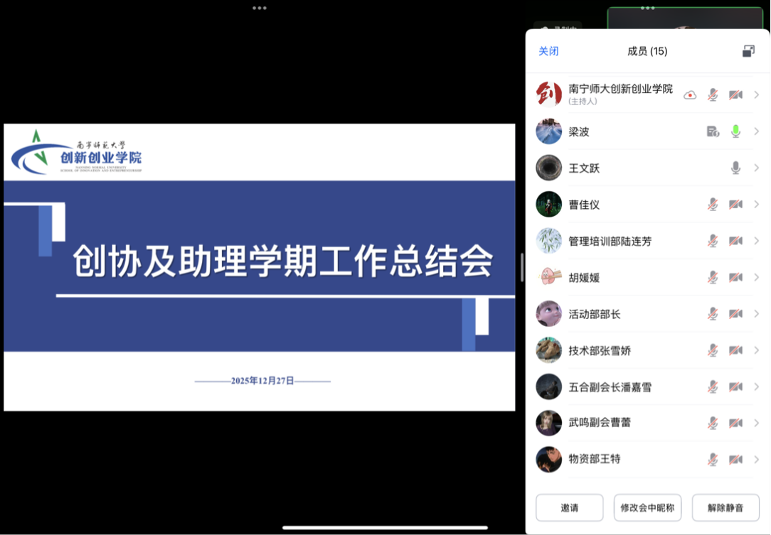 此次线上会议既全面复盘了学期工作的成效与不足,也明确了未来的发展方向。接下来,创新创业协会将立足现有基础,细化工作举措、优化运营细节,让各项工作稳步提质、更趋完善。